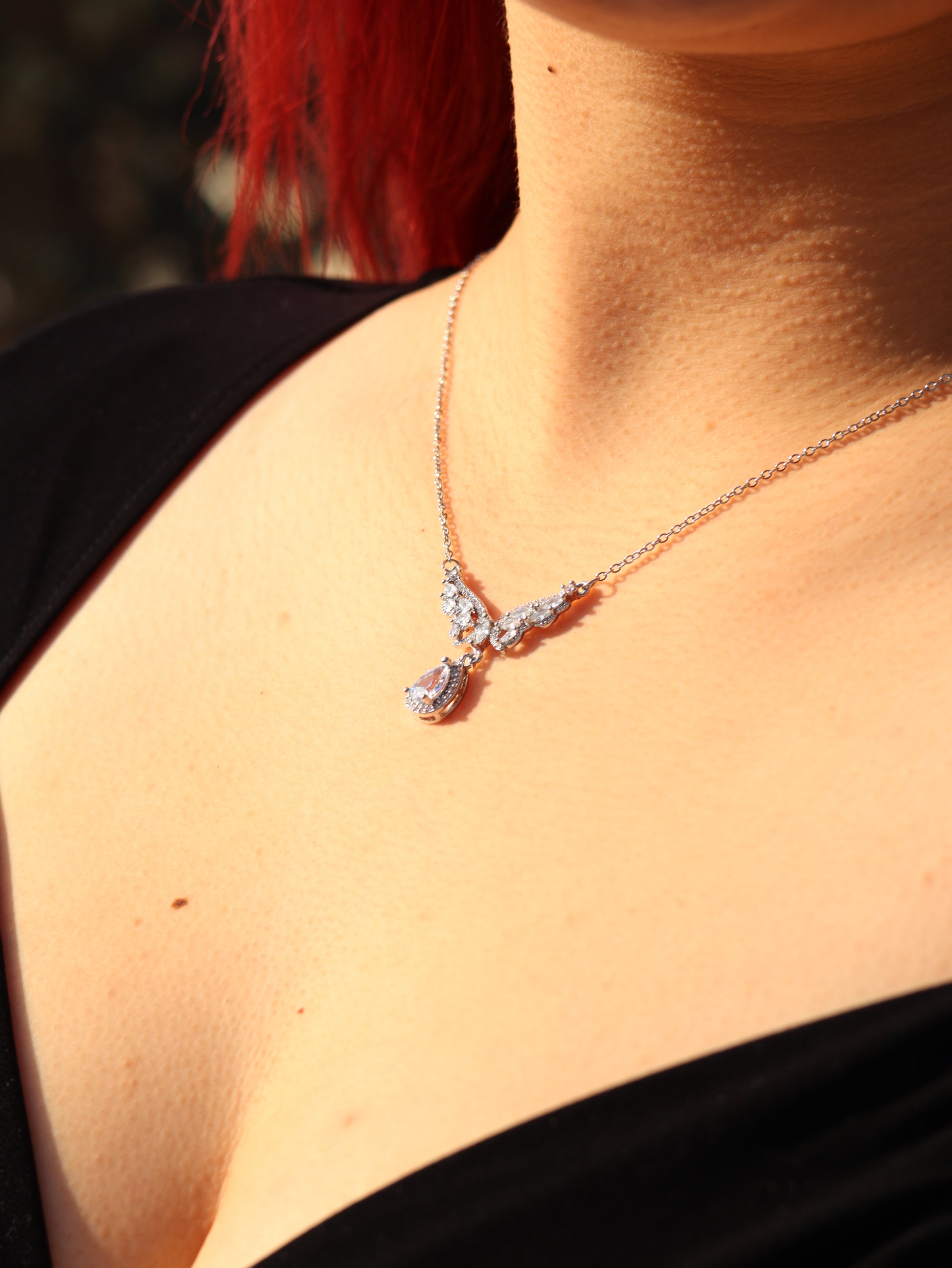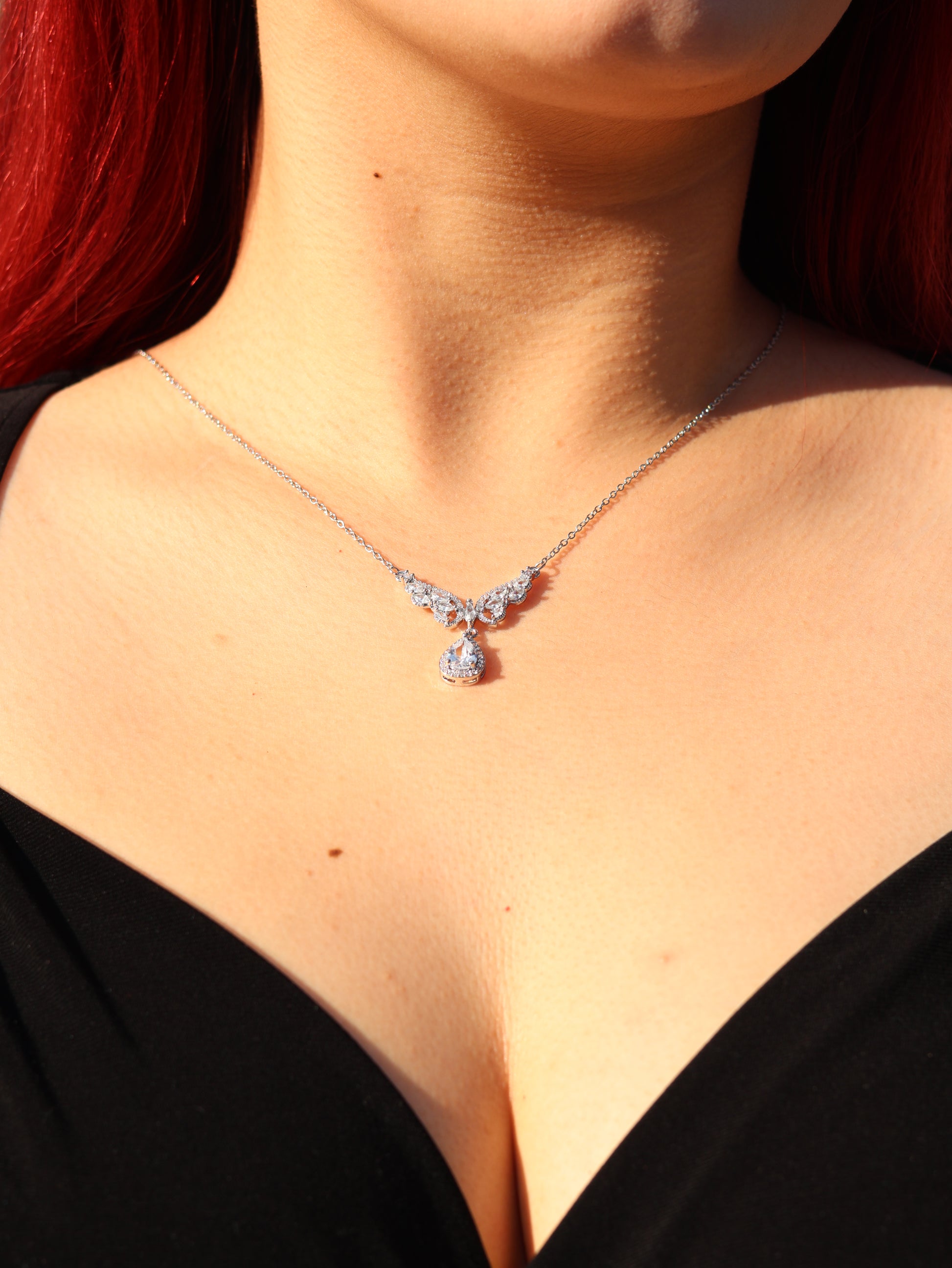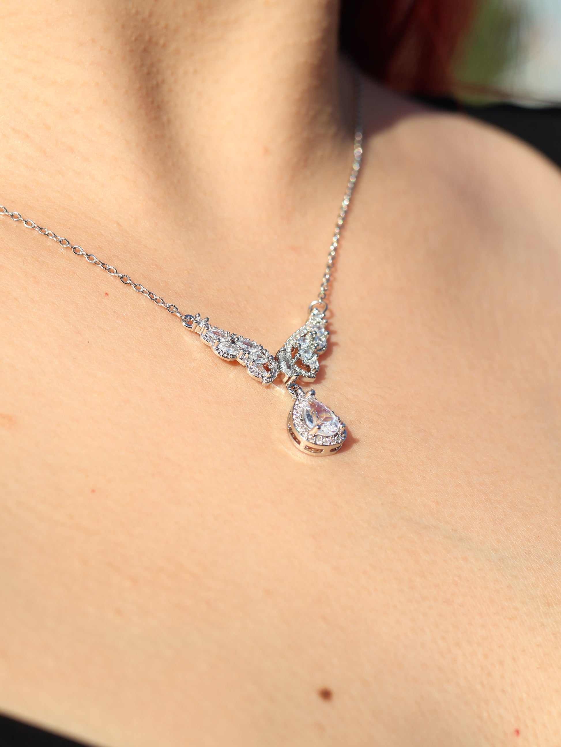Meleğin Gözyaşı Kolye, taşlarla süslenmiş zarif kanat detaylarından süzülen damla taş tasarımıyla benzersiz bir ışıltı sunar.