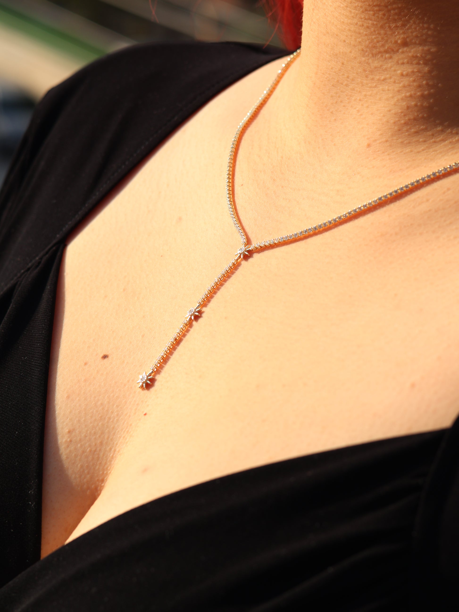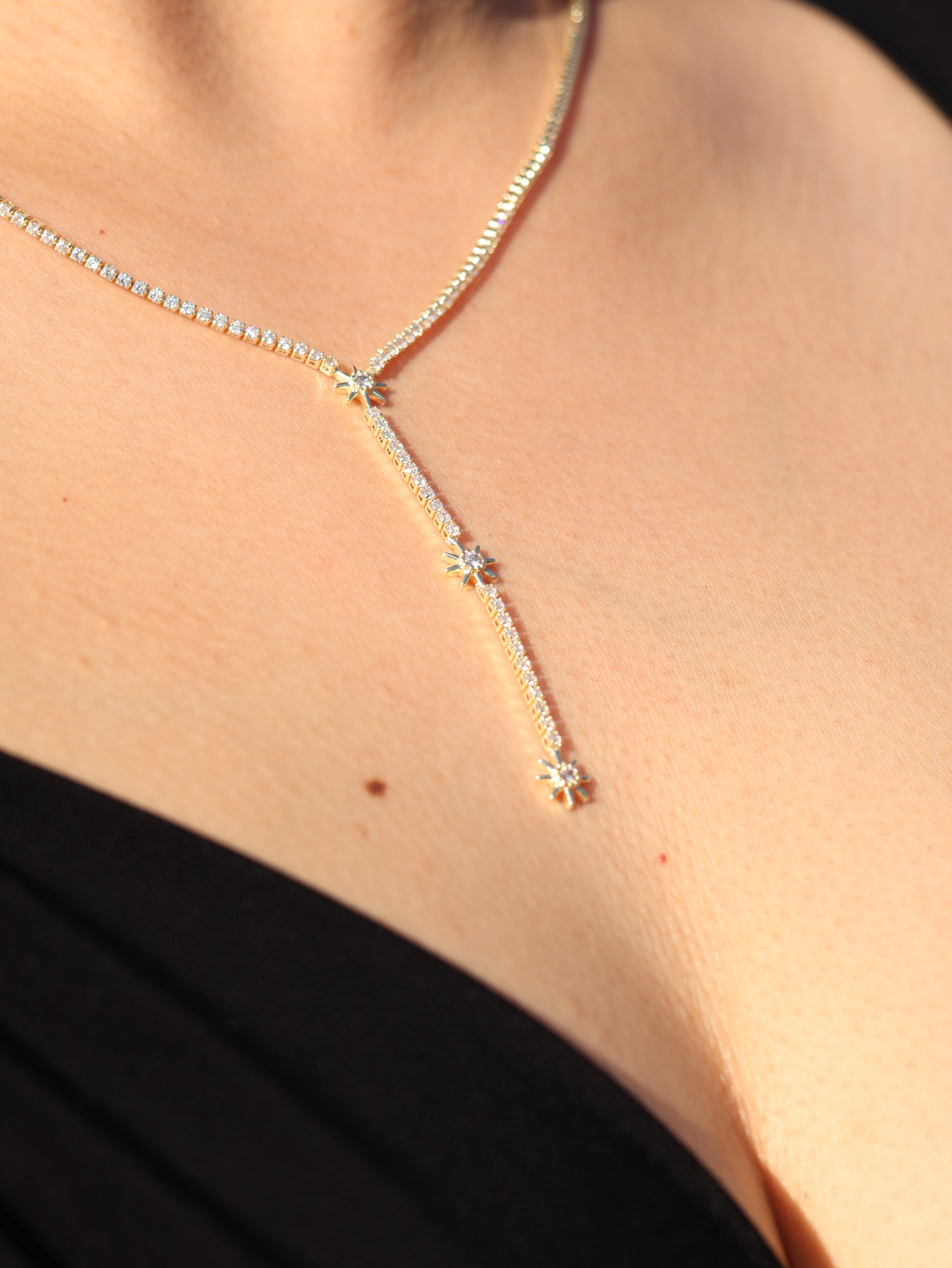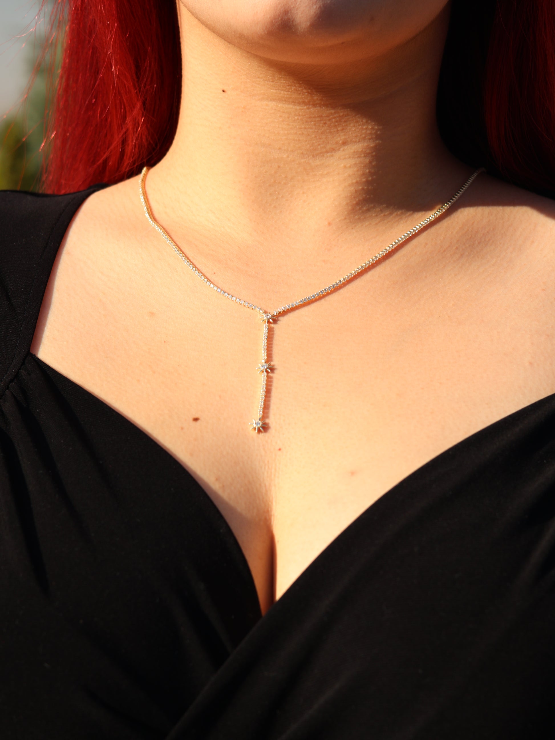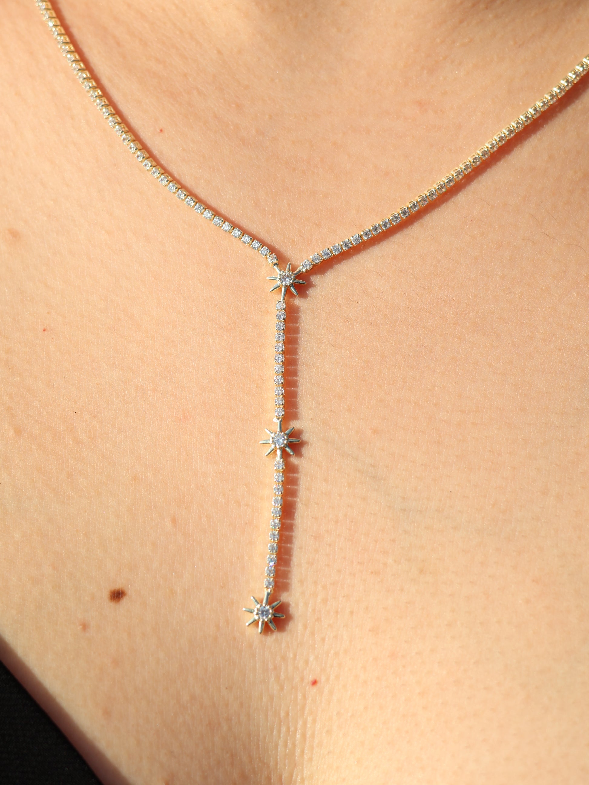 Yıldız Yağmuru Kolye, yıldız şeklindeki taşların akışkan bir dizilimle birleştiği zarif tasarımıyla göz alıcı bir şıklık sunar.